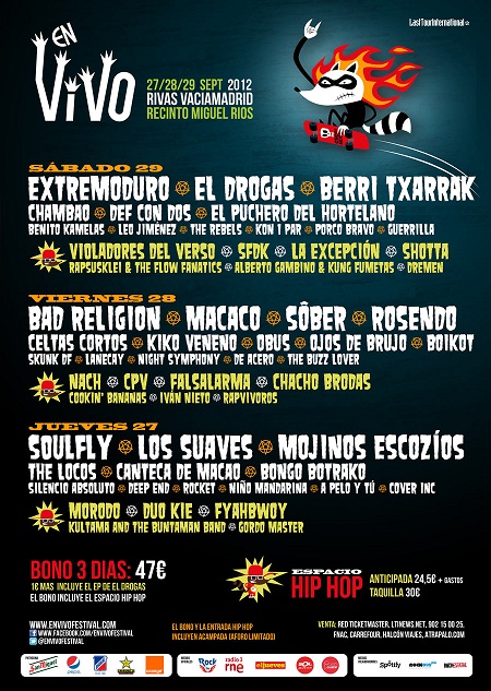Ahora ya podemos decir que en el En Vivo 2012 aún quedaban muchas sorpresas por desvelar… Bad Religion, Soulfly y Los Suaves encabezan la lista de diez incorporaciones que cierran el cartel de la tercera edición del festival, que tendrá lugar del 27 al 29 de septiembre en el recinto que se levantará en torno al Auditorio Miguel Ríos de Rivas Vaciamadrid y que contará con cuatro espacios de conciertos y 57 artistas. Bad Religion será el cabeza de cartel de la jornada del viernes 28, donde compartirá protagonismo junto a otros artistas de la entidad de Macaco, Sôber, Rosendo, Celtas Cortos, Nach o CPV. La combativa banda de Los Angeles entró a finales de julio al estudio a grabar su decimosexto disco. Formados en 1979 en el sur de California, Bad Religion son una de las formaciones más influyentes del punk-rock. Su disco ‘Suffer’, de 1988, ha sido catalogado por muchos críticos como el disco más relevante del género.