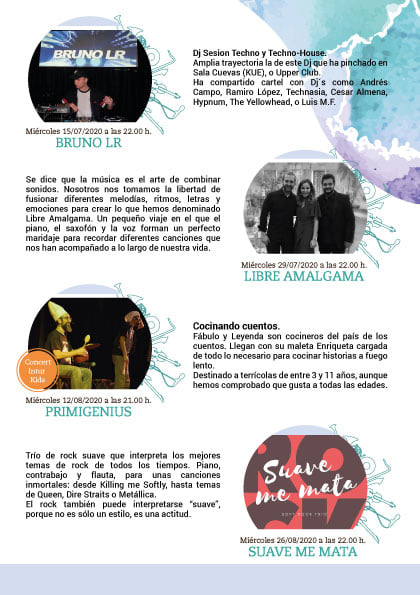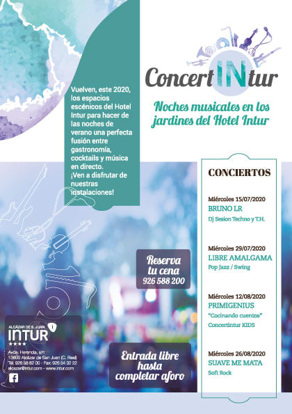 En este extraño año de 2020 vuelven los espacios escénicos del Hotel Intur de Alcázar de San Juan para hacer de las noches de verano un perfecta fusión entre gastronomía, cocktails y música en directo. Música para todos los gustos, para todas las edades, (incluido niños) en un entorno de lo más relajante con ambiente inmejorable.