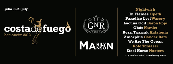 Marlyn Manson, Guns’n’Roses, Amorphis, In Flames, Katatonia, Rolo Tomassi y Noctem, encabezadas por los finlandeses Nightwish y los británicos Paradise Lost completan la lista de la primera edición del Festival Costa de Fuego de Benicàssim (Castellón) que atrae a auténticos clásicos de la escena estatal como Barón Rojo, Obús, Hamlet, Berri Txarrak, Cancer Bats, Lacuna Oil, Opeth, Stel Horse, WarCry y We Are The Ocean.