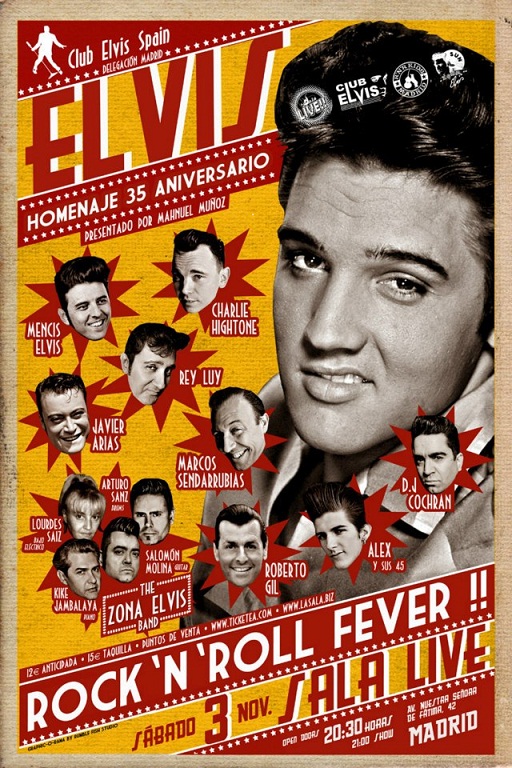 Si eres de los que se calzan los pitillo y se peinan el tupé a ritmo de Rock and Roll estás de suerte porque el Club Elvis España, y con motivo del 35 aniversario de la desparición física de Elvis, el próximo 3 de noviembre presenta en Madrid su nueva Delegación con una fiesta por todo lo alto en la Sala Live, C/ Nuestra Señora de Fátima, 42, Madrid. A las 21:00 horas (apertura de puertas 20:30 horas)