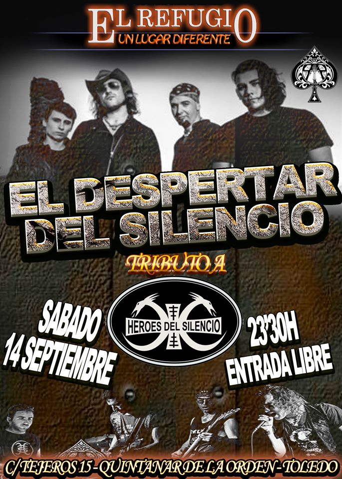 El grupo El Despertar del Silencio, banda tributo de Héroes del Silencio, actuará el sábado 14 de septiembre , a las 23:30 horas, en El Café Pub El Refugio de Quintanar de la Orden (Toledo), donde ofrecerá un amplio recorrido por las grandes canciones de la mítica formación zaragozana.