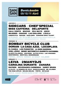 En IFEMA, dentro de Fitur Festivales, la organización del SanSan ha revelado las últimas confirmaciones para su séptima edición que se celebrará el 9, 10 y 11 de abril en Benicàssim: El Kanka, Rizha, Monterrosa, Los Vinagres, La Plata, La Sonrisa de Julia y Meritxell Nedderman.         Bombay Bicycle Club, Leiva, Sidecars, Dorian, Xoel López, Zahara, Rayden, Novedades Carminha, Mucho CHEF´SPECIAL, Derby Motoreta’s Burrito Kachimba, Gimnástica, Arco, Tórtel, Chucho, Uniforms, Molina Molina, Nerabe, Badlands, Blanco Palamera, Miss Caffeina, La Casa Azul, Carolina Durante, La Bien Querida, Delaporte, Las Chillers, The Crap Apples, Los Punsetes, Varry Brava, Loco Playa, Cala Vento, Mujeres, Rusos Blancos, Glitch Gyal, Mr.Kilombo, Zea Mays, Lígula o Betacam completan el cartel de este año. Durante la presentación, los responsables del SanSan han estado acompañados, por sorpresa, por El Kanka y Rizha.  El artista