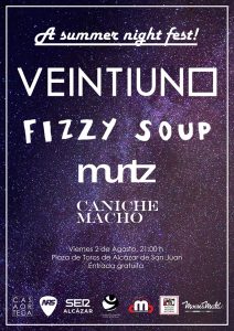 Alcázar de San Juan será escenario el próximo 2 de agosto de uno de los festivales musicales más atrevidos de toda la provincia. Veintiuno,  Fizzy Soup,  Caniche Macho y Muntz, serán los grupos que protagonizarán una noche de verano llena de música para todos los gustos.       Estilos como el pop, el rock, y el folk, estos cuatro grupos castellano-manchegos harán disfrutar de un concierto donde la música independiente y alternativa se apoderará de la noche alcazareña.  Con entrada gratuita y en la plaza de toros de Alcázar de San Juan, esta primera edición de ‘A summer night fest! ‘ un festival organizado por la Asociación juvenil de Alcázar, Nelson Rock School ofrecerá una velada donde la música