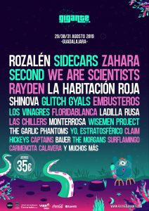Un año más Guadalajara se prepara para disfrutar de una nueva entrega del Gigante Festival, que celebrará su sexta edición los días 29, 30 y 31 de agosto de 2019. El festival volverá a contar con la mejor música, el mejor ambiente y un montón de sorpresas. We Are Scientists, Rozalén, Zahara, La Habitación Roja, Shinova, Second, Sidecars, Rayden, Embusteros, Los Vinagres, YO, Estratosférico, Glitch Gyals, Floridablanca, Monterrosa, Hickeys, Ladilla Rusa, Las Chillers, Wise Men Project, The Garlic Phantoms, Claim, Captains, Bauer, The Morgans, Surflamingo y Carmencita Calavera son los artistas confirmados hasta el momento. Al cartel final del Festival se añadirá el ganador del TALENTO GIGANTE un concurso de grupos o/y solistas cuyos tres finalistas más votados actuarán el