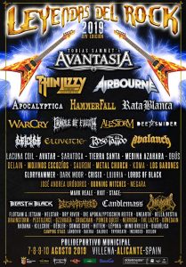 Leyendas del Rock 2019 se celebra los días 7, 8, 9 y 10 de agosto en el Polideportivo Municipal de Villena (Alicante).  En total serán 66 bandas las que pasarán por los escenarios de este festival  de heavy metal y hard rock que este año llega a  su XIV edición.  El festival alicantino estará encabezado por el proyecto personal de Tobias Sammet, AVANTASIA, la legendaria formación irlandesa THIN LIZZY y los australianos AIRBOURNE.Entradas y abonos a la venta en ticketmaster.es Página oficial de Leyendas del Rock