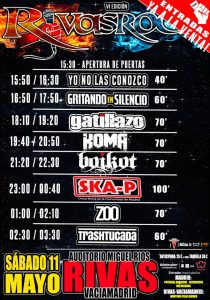 La próxima edición del festival Rivas Rock regresará a la ciudad de Rivas Vaciamadrid, muy cerca de Madrid, el próximo sábado 11 de mayo de 2019.  Este año el cartel lo encabeza SKA-P. El grupo madrileño presentará en el festival Rivas Rock su nuevo disco «Game Over» (2018) en una fecha en exclusiva en la Comunidad de Madrid. Además, el cartel lo completan las siguientes bandas: Gatillazo, Boikot, Zoo, Koma, Trashtucada, Gritando en Silencio y Yo No Las Conozco. Las entradas anticipadas se encuentran a la venta a un precio de 25 euros (+ gastos) en wegow.com. El precio en taquilla el mismo día del evento será de 30 euros. La apertura de puertas será a las 15:30h. Los organizadores recomiendan ir un día antes y cambiar la entrada por la pulsera