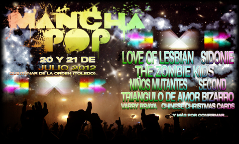tendrá lugar los días 20 y 21 de julio en Quintanar de la Orden (Toledo). Mancha Pop pone a la venta las entradas anticipadas a 25 € aprovechando el tirón de las navidades, y presenta el cartel, que seguro, tendrá alguna incorporación más, a medida que vayan avanzando las fechas, hasta el momento estos son los grupos confirmados: Love of Lesbian, Sidonie, The Zombie Kids, Second, Triángulo de Amor Bizarro, Chinese Christmas Cards, Varry Brava y Niños mutantes.