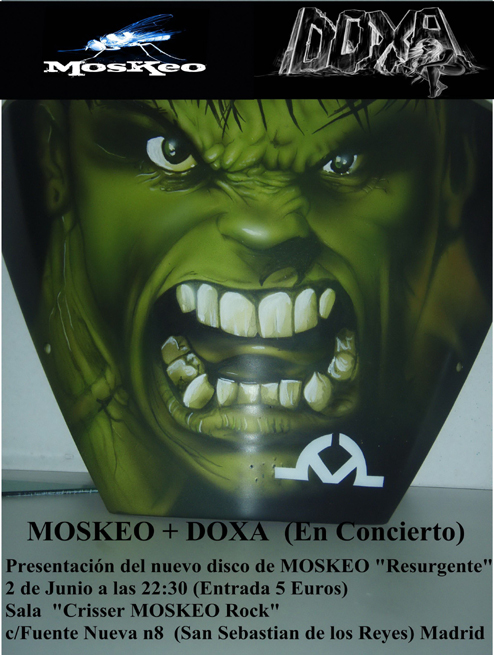 Moskeo, la banda de Alcobendas que se dio a conocer a finales de 2010 con su disco y ya reconocido himno «No Soy Tu Perro», acaba de terminar la grabación de su nuevo disco «Resurgente» y lo presentarán el día 2 de junio en casa inaugurando una nueva sala en San Sebastián de los Reyes. El disco tiene tintes de diferentes estilos, toques más heavies pero manteniendo la esencia que les caracteriza. La sala se llama Crisser Moskeo Rock, está en c/Fuente Nueva 8, San Sebastian de los Reyes (Madrid) a las 22.30h y costará 5€. Estarán acompañados de la banda madrileña Doxa.
