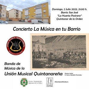 Los vecinos del Barrio San José – Huerta Postrera, serán los anfitriones de esta nueva edición del concierto “La Música en tu Barrio” el próximo domingo 2 de julio a las 21h. En la parte alta de la Avenida Ramón y Cajal, junto a la residencia de ancianos Ntra. Sra. del Rosario y junto al parque municipal, se levantan los siete edificios que conforman dicho barrio Quintanareño, sobre los terrenos de la recordada huerta Postrera, la construcción se ejecuto entre 1970 – 1979. Como es habitual, un vecino del barrio será el encargado de presentar el concierto, para esta ocasión contaremos con D. Marciano Ortega, quien residió en la calle Huerta Postrera. Desde 2012, la música de banda, recorre cada