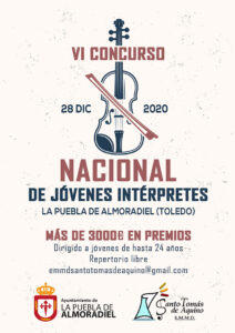 La Concejalía de Cultura del Ayuntamiento de la Puebla de Almoradiel junto a la Escuela Municipal de Música «Santo Tomás de Aquino» promueven el VI Concurso nacional de jóvenes intérpretes, dirigido a personas de hasta 24 años, dotado con más de 3000 euros en premios y que se celebrará el 28 de diciembre de 2020 En este concurso se pueden inscribir todos los jóvenes de nacionalidad española, con edad máxima de 24 años (cumplidos en 2020). Las categorías son: Categoría A: participantes desde 17 años (cumplidos o por cumplir en 2020) hasta 24 años. – Categoría B: participantes hasta 16 años (cumplidos en 2020). Los participantes se presentarán para cualquiera de estas especialidades: piano, cuerda (violín, viola, violonchelo, contrabajo, arpa y guitarra), viento metal (trompeta, trombón, trompa, bombardino y tuba), viento madera (oboe, fagot, flauta,