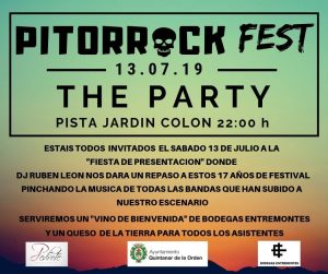 El sábado, día 13 habrá una fiesta de presentación en la Pista Jardín Colon a partir de las 21.00 h., con entrada libre, donde se servirá un vino de bodegas Entremontes para todos los asistentes y se pinchará la música de todos los grupos que han subido al escenario de la historia del festival, de la mano de Dj. Rubén León además de la participación de Franz Campoy con unas intervenciones que pondrán la nota de color urbano en el Festival 2.019.