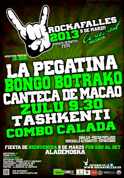 ROCKAFALLES 2013 ya está en marcha, el festival valenciano que organiza La asociación MESKEROCK CULTURAL. Como todos los años, también contarán con una zona de Djs, Mercadillo Alternativo, Exposiciones, los precios populares en barra tanto de bebida como de comida. Las entradas ya están a la venta on-line por 16€ gastos incluidos. Estos lo grupos participantes en esta edición: LA PEGATINA, BONGO BOTRAKO, CANTECA DE MACAO, ZULÚ 9.30 y las dos bandas ganadoras del concurso que daba derecho a participar en esta edición del festival; Tashkenti y Combo Calada.
