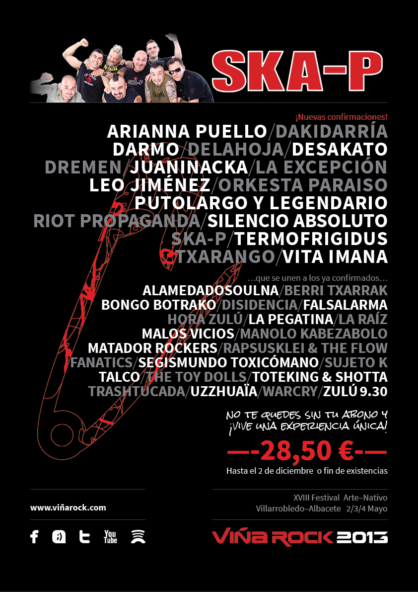 Los madrileños SKA-P, abanderados del sonido ska, de lo anti-sistema y de las reivindicaciones en general, vuelven a los escenarios en 2013 y lo harán por la puerta grande, presentando su nuevo disco en Viña Rock. La de Villarrobledo será su primera actuación en España tras tres años de silencio. Después de la colaboración de Habeas Corpus con Los Chikos del Maíz, poniéndole música al tema T.E.R.R.O.R.I.S.M.O., ambos grupos preparan un proyecto y gira bajo el nombre RIOT PROPAGANDA y que presentarán en Viña Rock 2013. Tras el éxito de sus actuaciones veraniegas, LEO JIMENEZ se encuentra ultimando los detalles de su esperado nuevo disco «Animal Solitario» que se editará en enero con Warner Music. Algunos como Putolargo y Legendario o Vita Imana repiten de la edición anterior, otros regresan después de un tiempo (La Excepción, Delahoja, Darmo, Silencio Absoluto, Arianna Puello o Juaninacka). Pero en la próxima edición también habrá sitio para bandas que actuarán en Villarrobledo por primera vez, como es el caso de Desakato, Txarango, Dremen, Termofrígidus o Dakidarría.